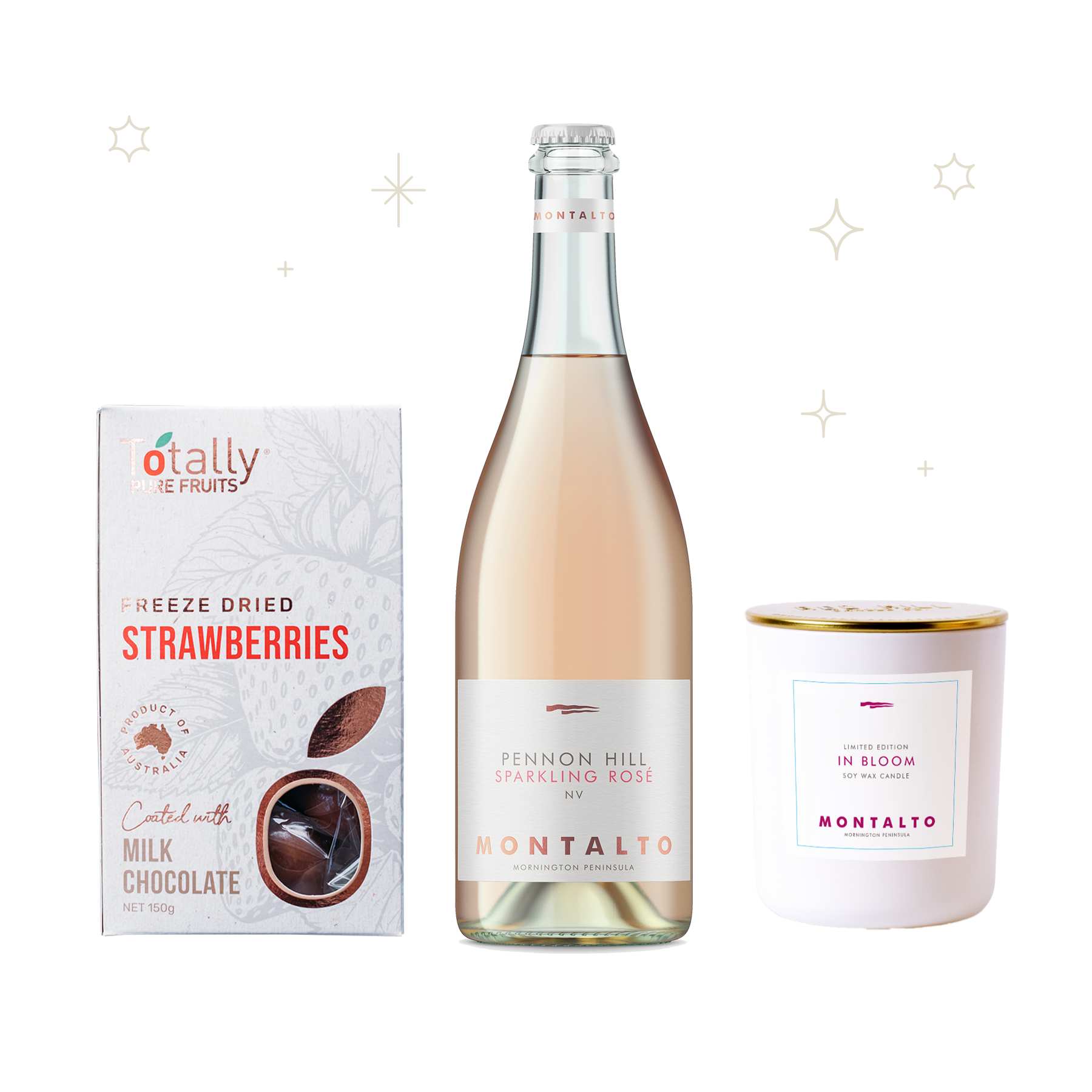 For those who love a little sparkle and sweetness. The Festive Indulgence bundle combines our vibrant Pennon Hill Sparkling Rosé NV with a hand-poured In Bloom candle and decadent chocolate-coated strawberries from local makers. A beautifully balanced gift of wine, fragrance, and indulgence — designed to delight.