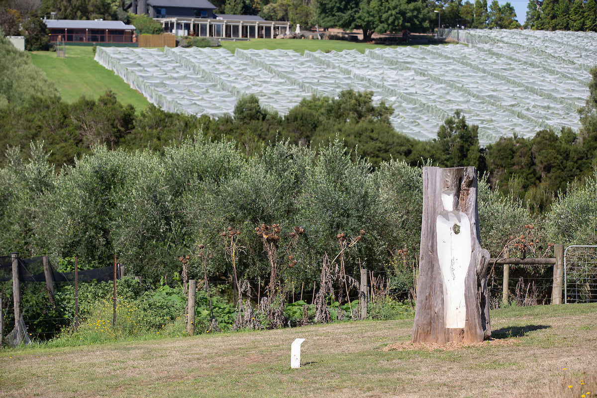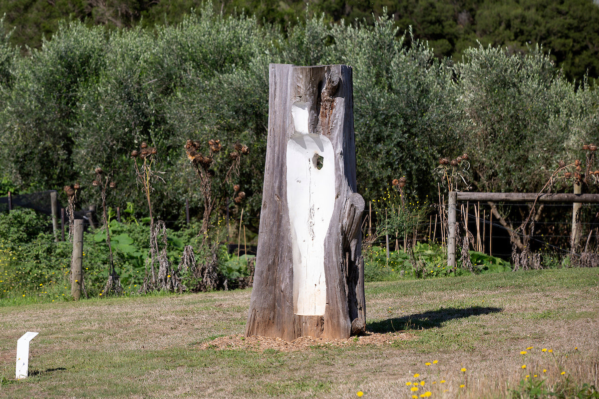 Carved directly into a fallen tree trunk, The Nature of Mankind presents a softly sculpted human form embedded within the timber’s natural contours. The figure is revealed through a contrasting layer of pale inner wood, inviting visitors to move around the piece and consider its shifting silhouette. Positioned near the olive grove, the work sits quietly in the landscape, emphasising presence, absence and the enduring materiality of the natural world.