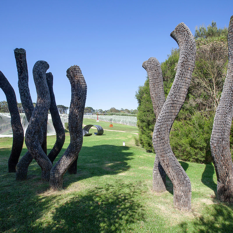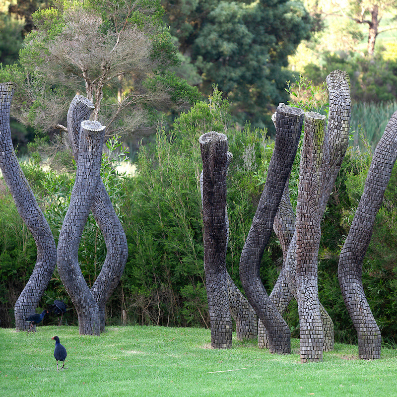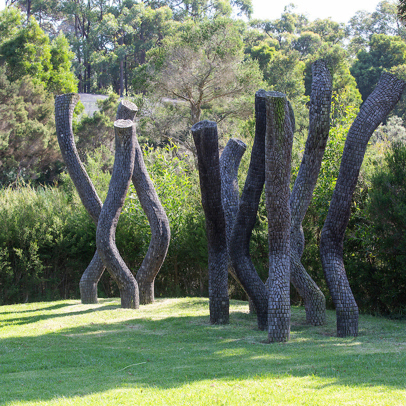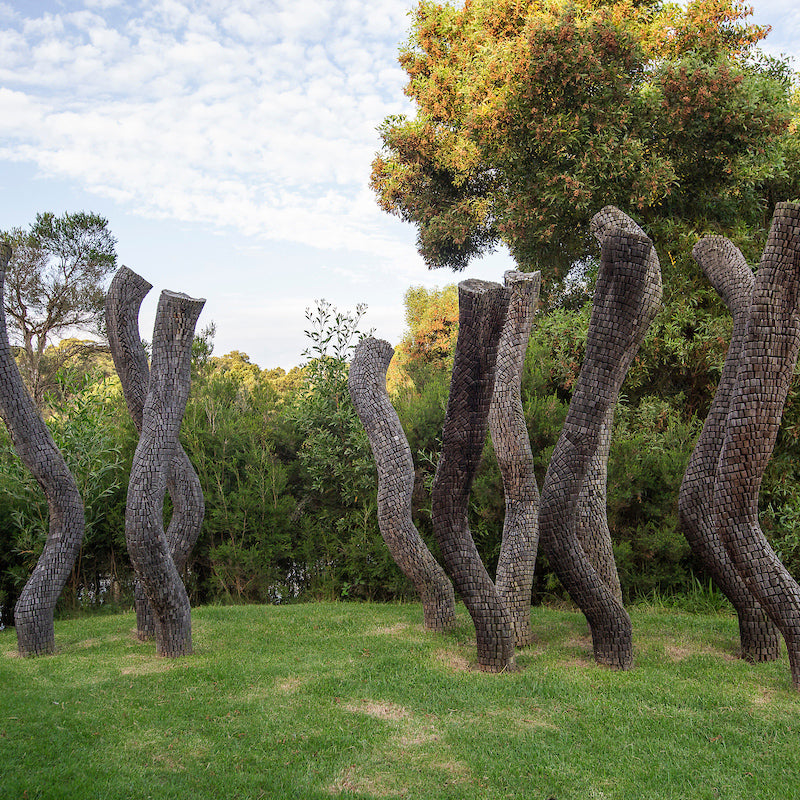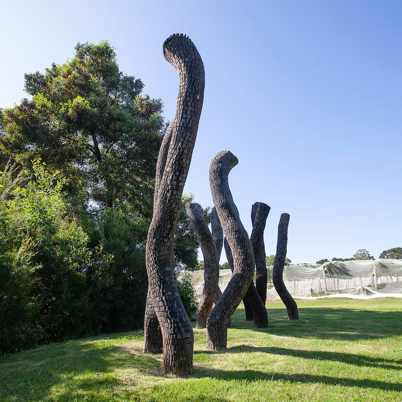 Hollow fibreglass poles, timber hardwood blocks, silicon