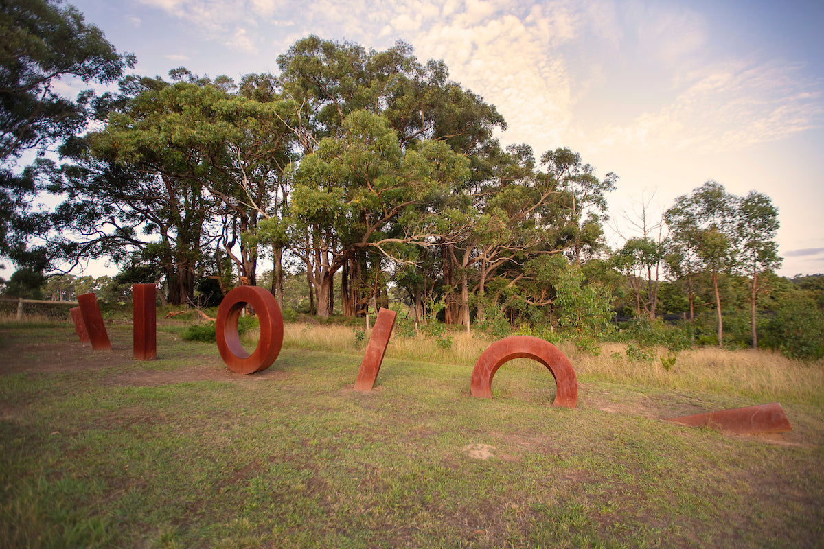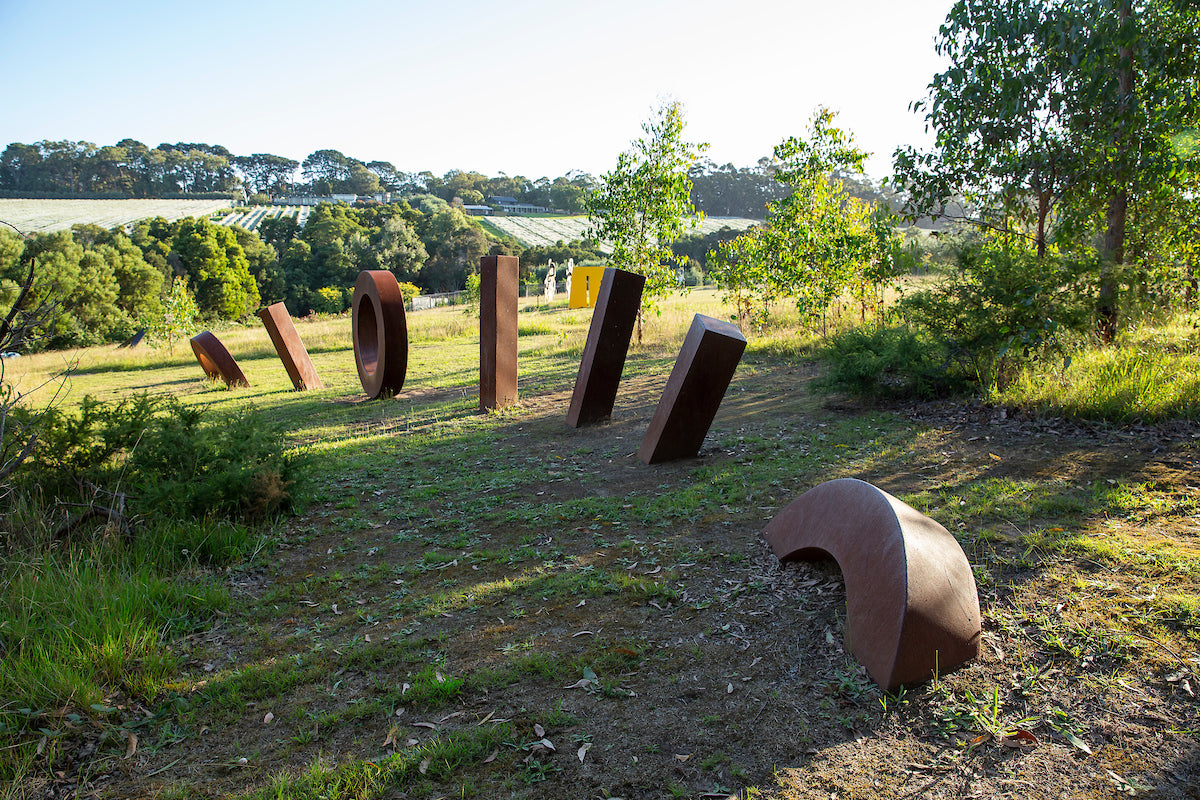 Tatton’s Encryption joined the Montalto collection in 2008. The sculpture embodies his interest in coded language, communication, and the intersection of the digital with the organic. Positioned on a gentle slope, the sequence of rising and falling steel forms behaves almost like a waveform or an interrupted message, grounding Tatton’s conceptual concerns within the Mornington Peninsula landscape.