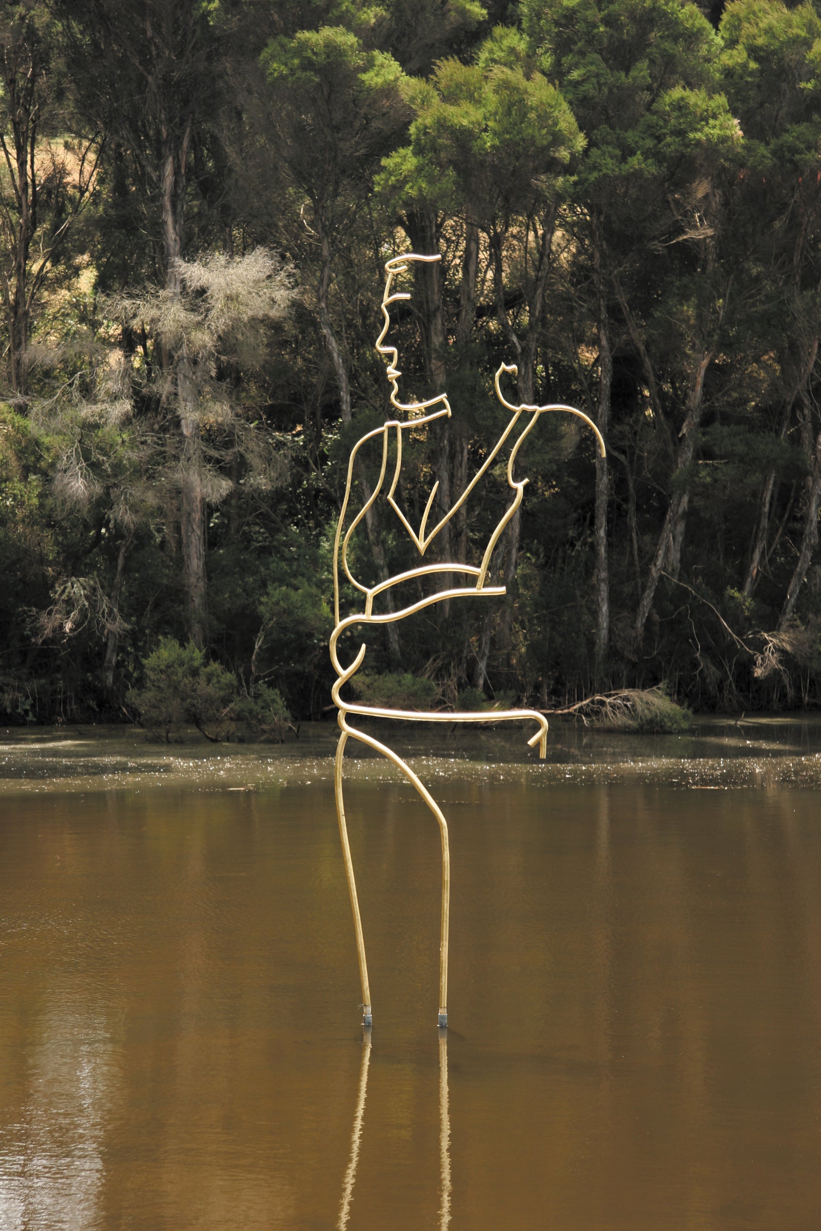 Figure in Landscapeis a solid line drawing of a female form where the landscape becomes the paper. The half rendered figure melds with and frames the background, emphasising the power and fecundity of nature. Suspended lightly within the environment, it shifts character with changes in light, season and water level.