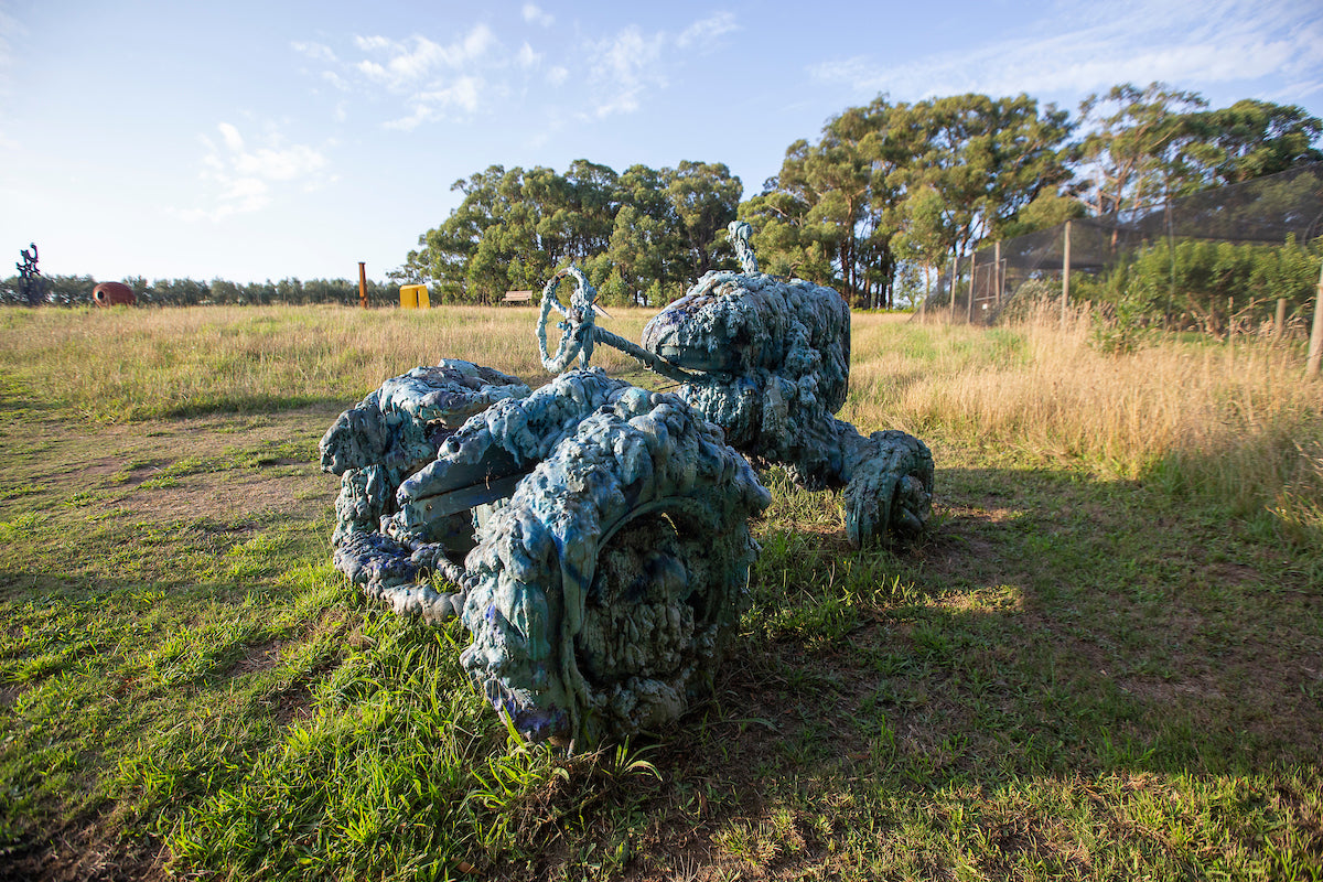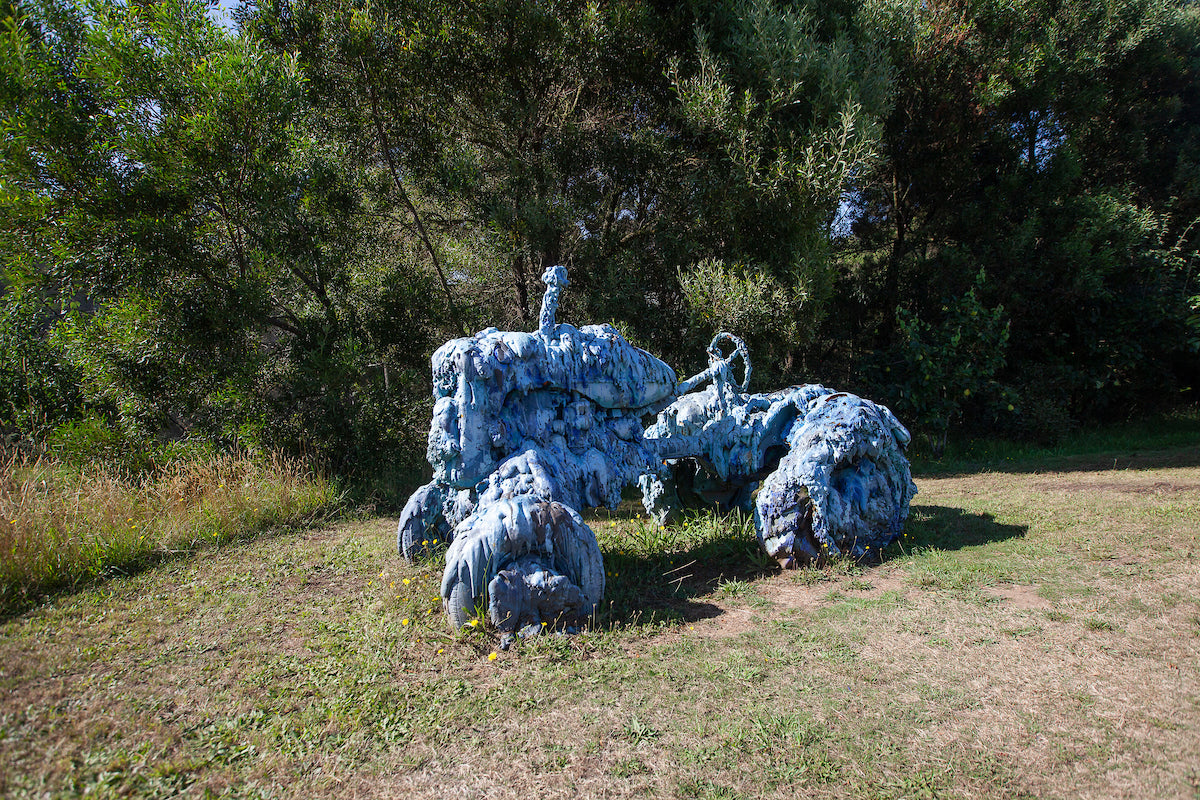 The work retains the familiar silhouette of the machine while obscuring and exaggerating its form, creating a dense, organic surface that appears to melt, swell, or calcify over time. Positioned on open ground along the Sculpture Trail, the piece invites visitors to slow down and experience the interplay between rural machinery, material experimentation, and the surrounding landscapes