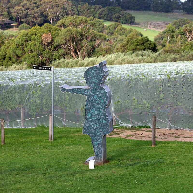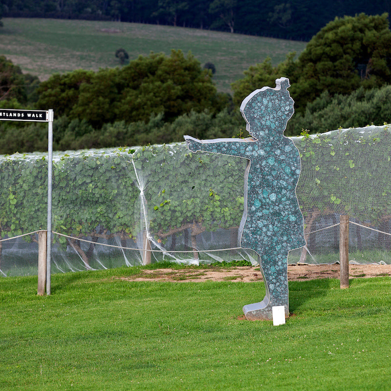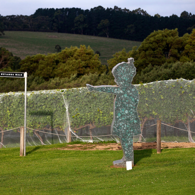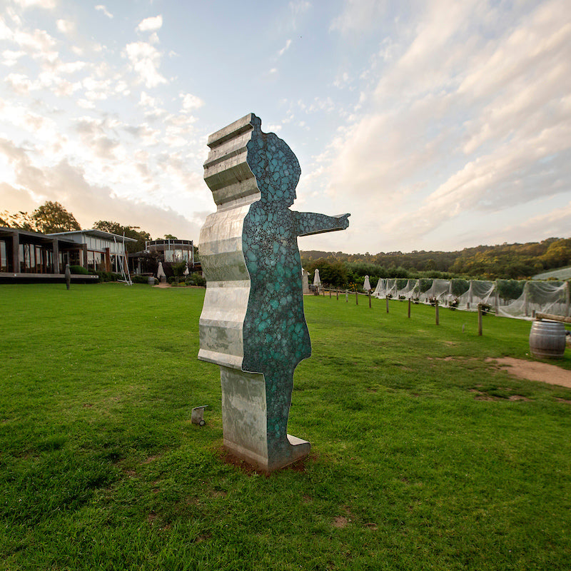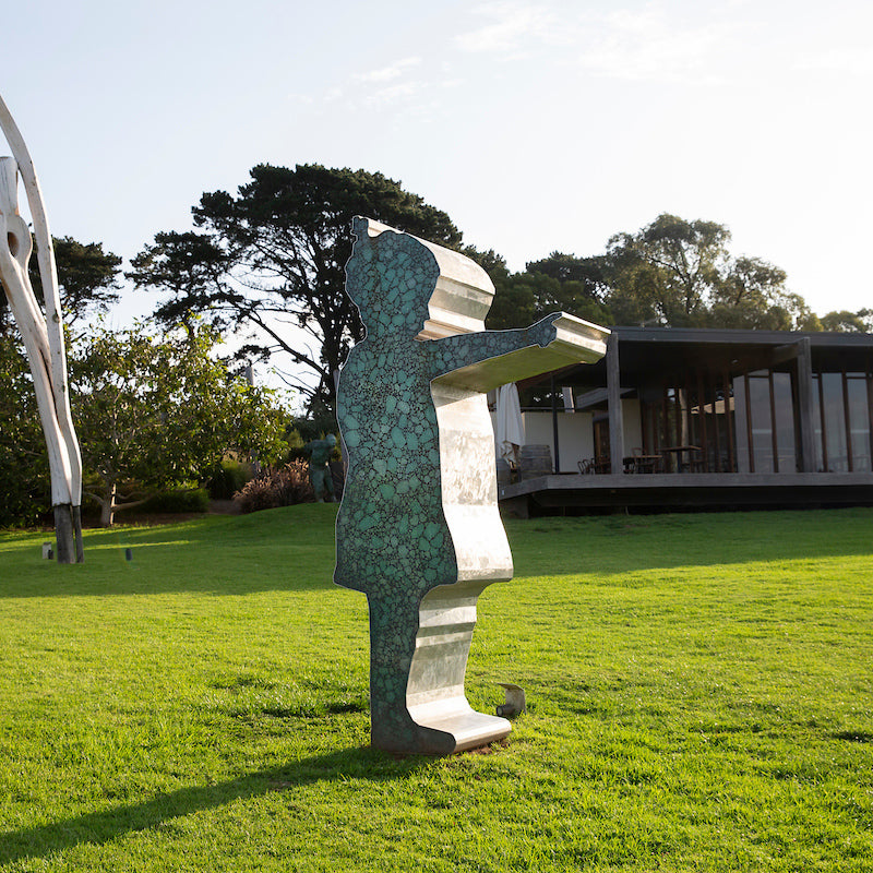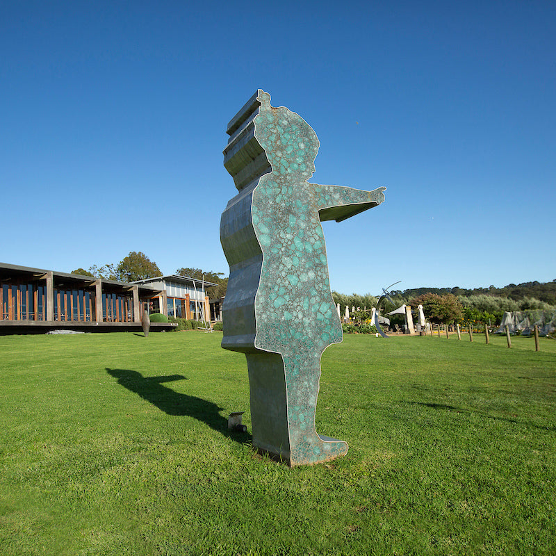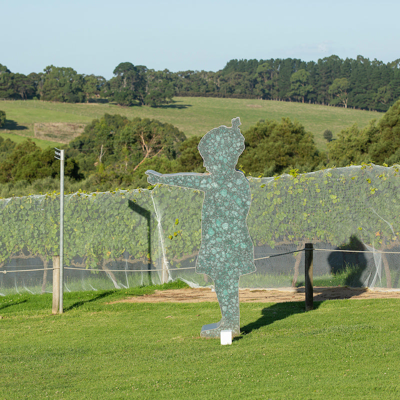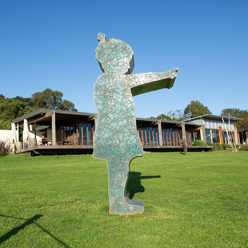 The work is a large-scale silhouette of a child figure constructed from aluminium and toughened plate glass.